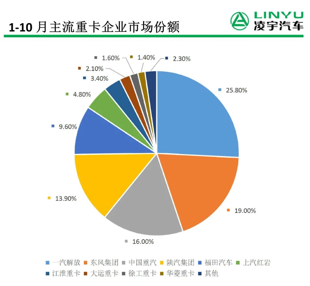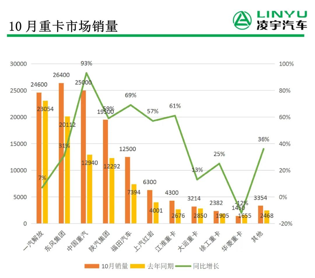 在十月的銷量大戰中,解放依然穩步邁進,表現為亮眼的企業是東風和重汽。