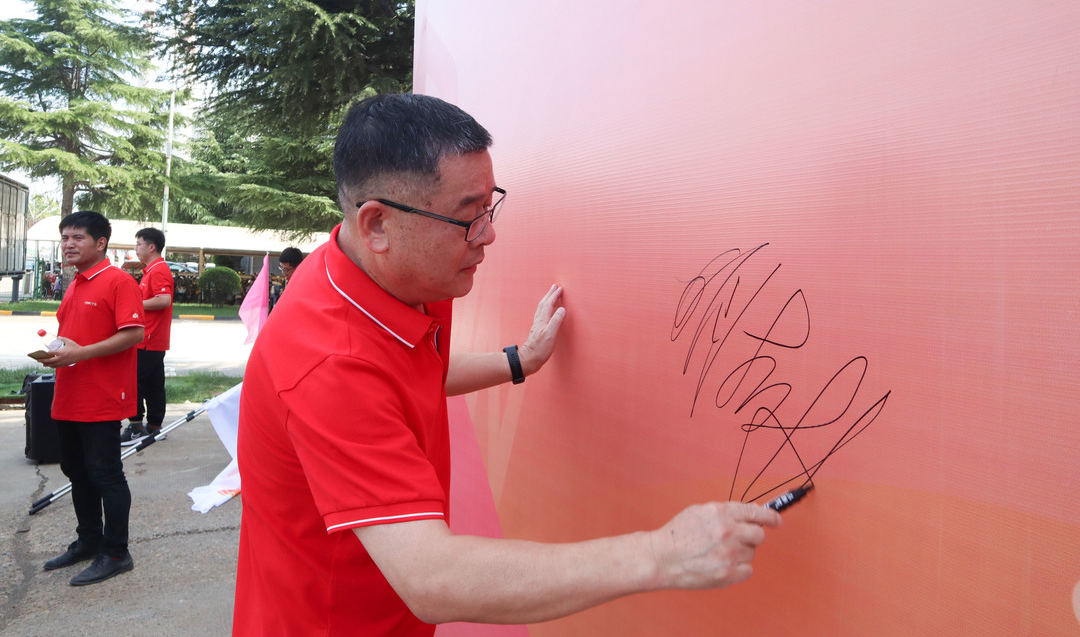 兩點三十五分,綜合部段浪濤先沖破終點,在已沖線人員的加油吶喊聲中,大家陸續抵達終點,在簽名墻上留下簽名,并合影留念。