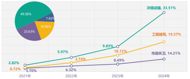 從新能源專用汽車的應(yīng)用場景分布看,市政環(huán)衛(wèi)、冷鏈運輸、工程建筑構(gòu)成三大主力板塊,合計占據(jù)92.5%市場份額。其中冷鏈運輸領(lǐng)域新能源滲透率達33.51%,居各細分領(lǐng)域之首,這主要得益于生鮮電商爆發(fā)式增長與疫苗等醫(yī)療冷鏈運輸?shù)膭傂孕枨蟆?/span>